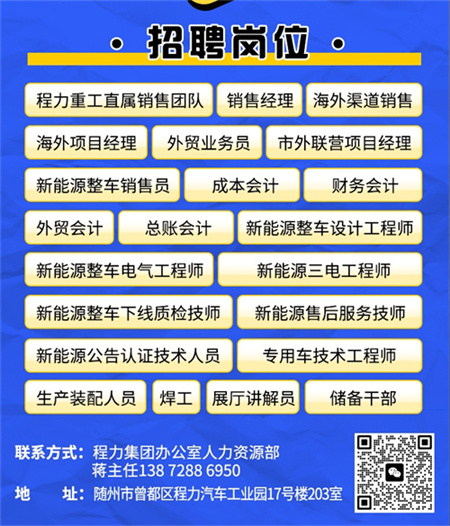 導讀:‌程力汽車集團2025年近期正在招聘多個職位,包括但不限于銷售、技工、工程師,新能源車型技術人員和海外銷售人員等‌。以下是一些具體的招聘信息:&#…