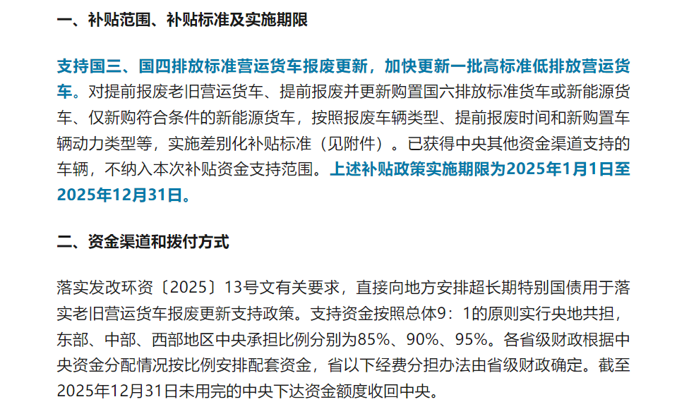 3月14日 深圳啟動(dòng)以舊換新實(shí)施方案 深圳市發(fā)展和改革委員會(huì)、深圳市財(cái)政局關(guān)于印發(fā)2025年超長(zhǎng)期特別國(guó)債資金加力擴(kuò)圍支持消費(fèi)品以舊換新實(shí)施方案的通知 ,明確指出,在2024年政策基礎(chǔ)上,將老舊營(yíng)運(yùn)貨車報(bào)廢更新補(bǔ)貼范圍擴(kuò)大至國(guó)四排放標(biāo)準(zhǔn)營(yíng)運(yùn)貨車。對(duì)提前報(bào)廢國(guó)四及以下排放標(biāo)準(zhǔn)營(yíng)運(yùn)柴油貨車,平均每輛補(bǔ)貼3萬(wàn)元;提前報(bào)廢并新購(gòu)國(guó)六排放標(biāo)準(zhǔn)貨車或新能源貨車,平均每輛補(bǔ)貼8萬(wàn)元;僅新購(gòu)新能源城市冷鏈配送貨車,每輛補(bǔ)貼3.5萬(wàn)元。