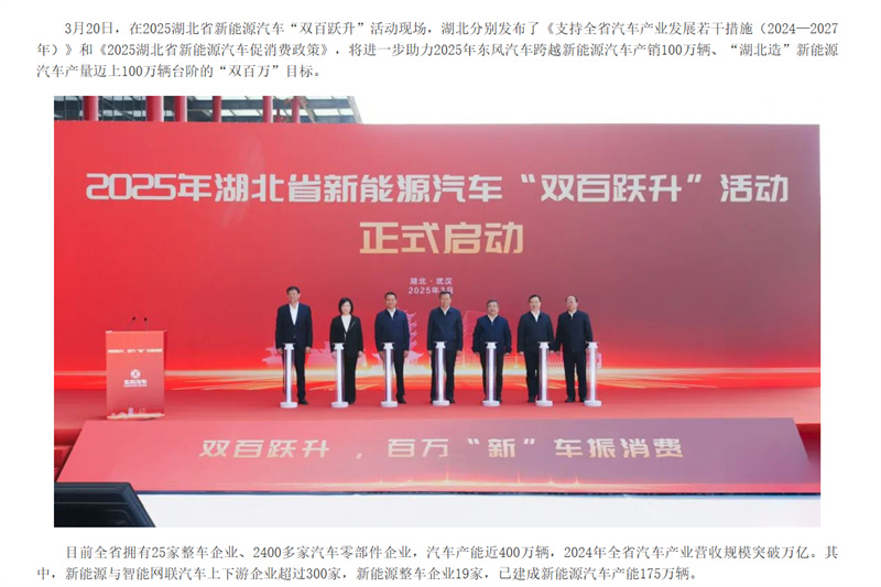 3月19日 (下午)三部門聯(lián)合升級(jí)貨車更新政策:交通運(yùn)輸部、發(fā)改委、財(cái)政部將老舊貨車補(bǔ)貼范圍擴(kuò)展至國(guó)三/國(guó)四排放車輛,取消燃料類型限制。根據(jù)新規(guī),提前報(bào)廢并更換新能源貨車的企業(yè)最高可獲14萬(wàn)元/車補(bǔ)貼,購(gòu)置國(guó)六車型補(bǔ)貼7萬(wàn)元。政策特別設(shè)置"綠色通道",對(duì)參與氫燃料電池車示范運(yùn)營(yíng)的企業(yè)額外給予3萬(wàn)元運(yùn)營(yíng)補(bǔ)貼。支持資金按照總體9:1的原則實(shí)行央地共擔(dān)。 3月20日 湖北省確定汽車產(chǎn)業(yè)“雙百萬(wàn)”目標(biāo) 湖北省分別發(fā)布了《支持全省汽車產(chǎn)業(yè)發(fā)展若干措施(2024—2027年)》和《2025湖北省新能源汽車促消費(fèi)政策》,將進(jìn)一步助力2025年“湖北造”新能源汽車產(chǎn)量邁上100萬(wàn)輛臺(tái)階的目標(biāo)。 3月21日 大同構(gòu)建新能源商用車生態(tài)圈 3月29日 央企重組開(kāi)啟產(chǎn)業(yè)新格局 3月,財(cái)政部的扶持政策不僅延長(zhǎng)了購(gòu)置稅減免期限,還加大了對(duì)充換電基礎(chǔ)設(shè)施和智能網(wǎng)聯(lián)技術(shù)的投入,為新能源專用車的市場(chǎng)推廣和基礎(chǔ)設(shè)施建設(shè)提供了有力保障。此外,三部門聯(lián)合升級(jí)的貨車更新政策,提供了豐厚的補(bǔ)貼,將促進(jìn)新能源專用車的銷售。湖北省確定汽車產(chǎn)業(yè)“雙百萬(wàn)”目標(biāo)不僅為當(dāng)?shù)?/span>提供了政策支持和市場(chǎng)需求保障,還促進(jìn)了產(chǎn)業(yè)鏈的協(xié)同發(fā)展和新能源專用車的普及推廣。這一系列政策將有助于推動(dòng)新能源專用車產(chǎn)業(yè)的快速發(fā)展和壯大。 |