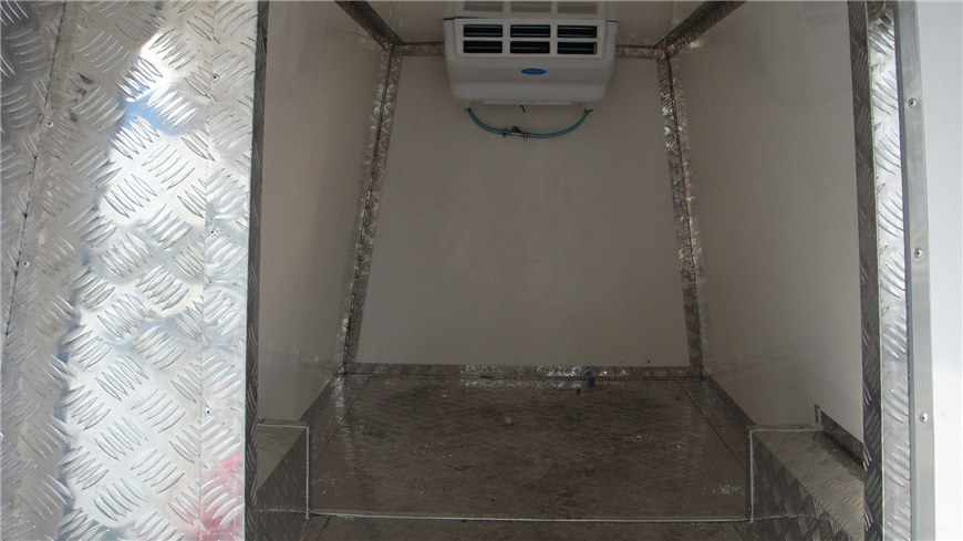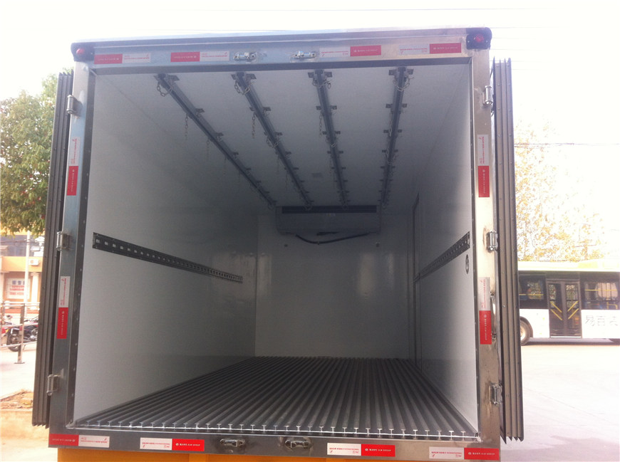 二,保溫箱體 湖北程力冷藏車的質(zhì)量好不好一般因素是看箱體的質(zhì)量,好的冷藏車箱體不漏熱,質(zhì)量輕,箱體結(jié)實(shí)不變形起泡。湖北程力公司自主研發(fā)的冷藏車第五代產(chǎn)品融合:"無縫結(jié)合箱體技術(shù)”,“全自動(dòng)恒溫系統(tǒng)”,“全方位冷藏車監(jiān)控系統(tǒng)”,“全球冷凍數(shù)據(jù)回饋技術(shù)”,箱體填充除了保留傳統(tǒng)的“高密度聚氨酯”外,新增“航空材質(zhì)高密度玻璃纖維”。廂板為三明治式結(jié)構(gòu),內(nèi)外蒙皮,中間輕鋼龍骨架及8厘米高密度聚氨酯保溫材料,采用國(guó)際先進(jìn)的大型真空負(fù)壓機(jī)一次性負(fù)壓成型,表面光潔平整,強(qiáng)度高,整體質(zhì)量輕,保溫性能良好,無滲漏。箱體內(nèi)外蒙皮可根據(jù)用戶的實(shí)際需求選用玻璃鋼板,鋁合金板,彩鋼板,不銹鋼板等材質(zhì)制作。用戶也可以根據(jù)運(yùn)輸介質(zhì)的不同選裝滑道,肉鉤,通風(fēng)槽,側(cè)開門等。