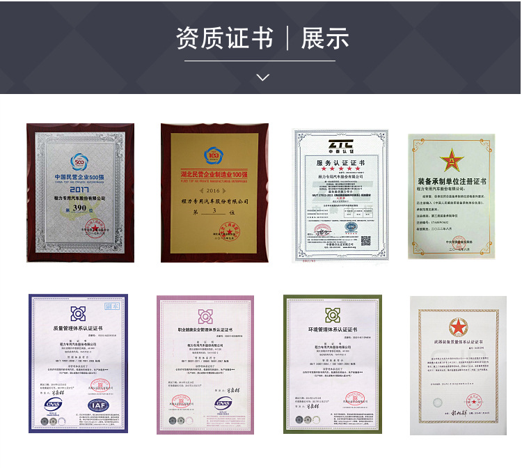 多樣│滿足各種專汽需求 專用車產(chǎn)業(yè)細分產(chǎn)品眾多,每個產(chǎn)品的市場格局由于行業(yè)門檻和市場特征的不同具有較大差異。隨著高等級公路的建設(shè)、物流市場的逐漸成熟,以及國內(nèi)大量基礎(chǔ)設(shè)施建設(shè),專用汽車產(chǎn)品結(jié)構(gòu)較過去有了很大變化,重型車和輕型車比例處于增長趨勢,中型車比例繼續(xù)下降;體現(xiàn)專用功能特性的產(chǎn)品比重加大;種數(shù)得到大幅增加,產(chǎn)品結(jié)構(gòu)更加合理。 程力主要產(chǎn)品包括灑水車、加油車、冷藏車、油罐車、垃圾車、吸污車、道路清掃車、高壓清洗車、高空作業(yè)車等八大系列100多個品種車型及其相關(guān)專用汽車配件,技術(shù)力量雄厚、檢測手段完備,擁有大型設(shè)備750臺(套)及16條總裝生產(chǎn)線。 產(chǎn)品質(zhì)量穩(wěn)定,經(jīng)營方式靈活,公司現(xiàn)已全面通過ISO9001-2008 國際質(zhì)量體系認(rèn)證、3C國際強制產(chǎn)品認(rèn)證,并通過出口產(chǎn)品的各項認(rèn)證。“程力威”產(chǎn)品有680多個品種上國家公告目錄,其中有不少的車型如灑水車、垃圾車、吸污車、吸糞車等環(huán)衛(wèi)系列車型享受國家免車輛購置稅優(yōu)惠條件。