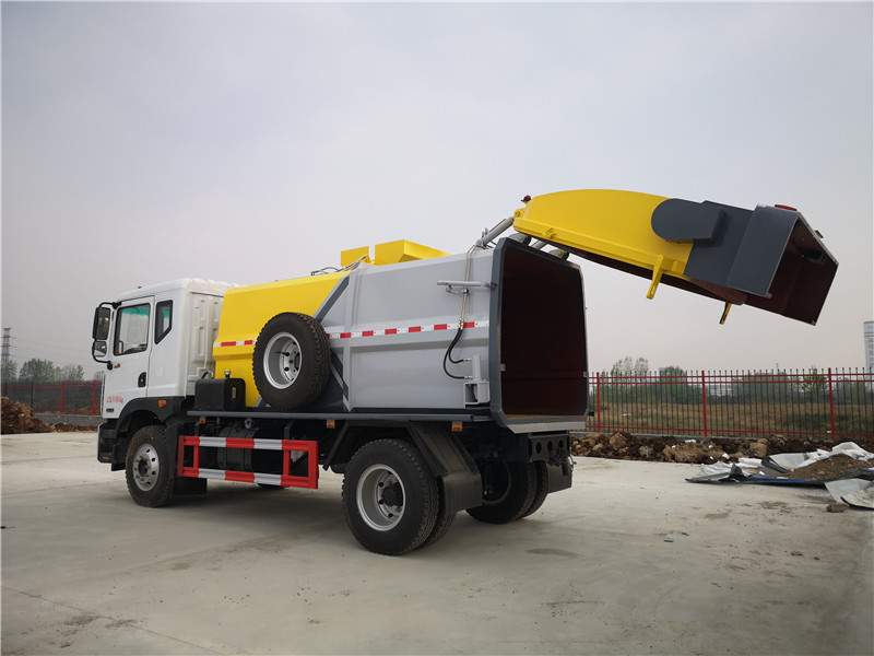 c、罐體容積8.5-10方,罐體帶舉升功能,后門液壓控制開啟關閉,帶液壓鎖緊功能,拉桿提升機聯動頂蓋完美設計,收集時滴水不漏。提升架可掛 120L/240L 標準塑料垃圾桶