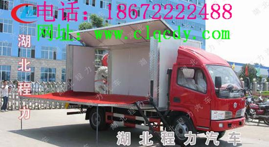 流動舞臺車的結構功能說明:流動舞臺車:通過機械裝置展開、搭建成具有頂棚和舞臺版演出的舞臺,并配備安裝舞臺燈光、音響等所需的專門裝置及電源接口等廂式專用車輛