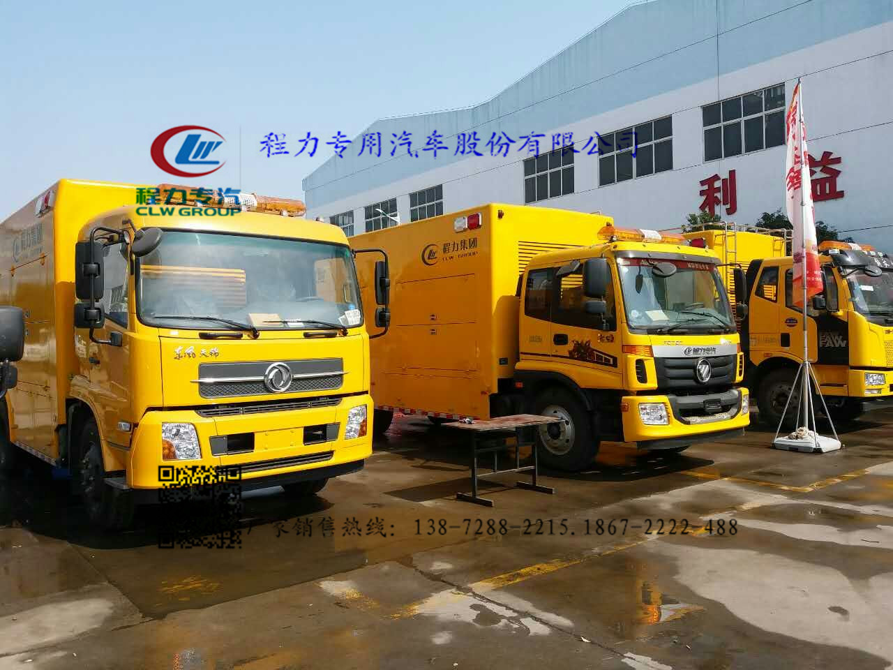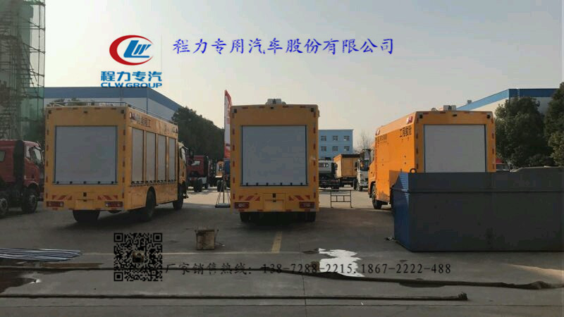 箱體:箱體外部鋼材為優質冷軋鋼板,內襯優質冷軋鋼板折彎骨架,工藝先進,強度牢固。箱體為全密封結構,具備運輸,防雨,防腐,防火,防銹要求。車廂尾部安裝鋁合金卷簾門,發電機組進排風消聲處理,消聲器做降噪處理,車廂水泵兩側設開門,發電機進分口和排風口防雨百葉窗,工作門下,尾部設有隱藏式抽拉梯,與車廂底板框架連接。