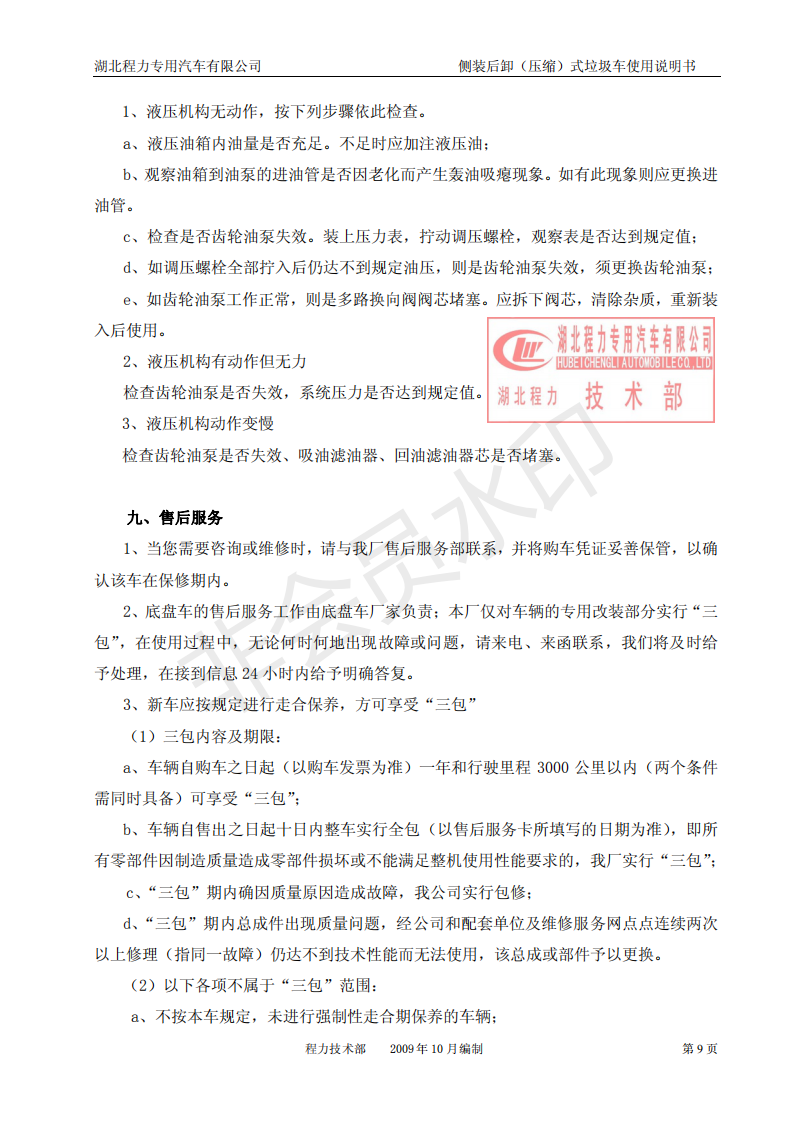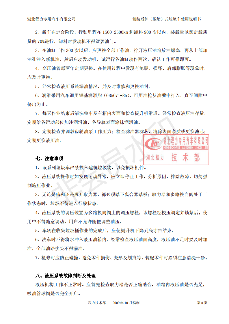 湖北程力側(cè)裝后卸(壓縮)式掛桶垃圾車使用說明書