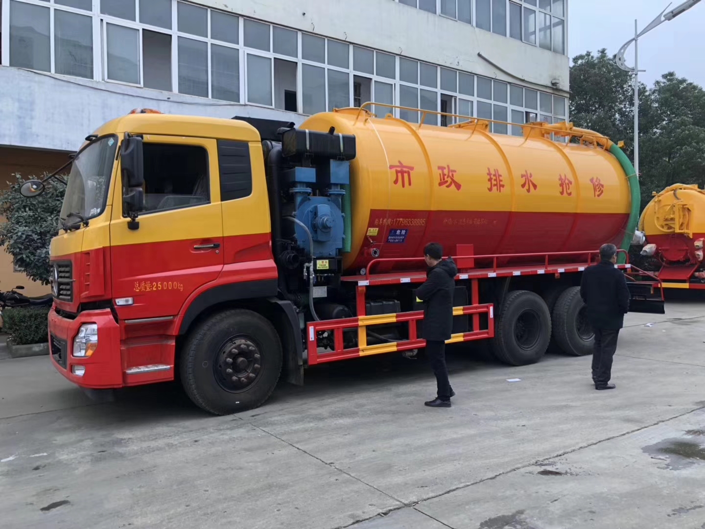 ✳ 清洗裝置:配天津通潔300升高壓泵, 60米PVC雙層高壓管22通徑高壓管,10個高壓噴頭,兩個水泥蓋,頂部100的互通,水污互通用100的球閥。 水罐3寸球閥安在罐體最底部.水倉污倉罐體內噴防銹,后封頭600的液壓口,一個6寸自流,一個4寸的進料口,一個4寸的排污口,側面一個6寸的球閥偷排。后蓋加裝活動可拆式卷盤壹套,右后側一套卷盤,罐體采用8個厚鋼板制作,后蓋上帶一個600液壓口排污,300側邊自流口。
